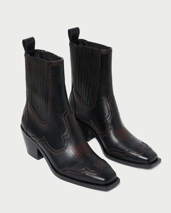 Elevate your style with these chic mid-heel Western ankle boots crafted in premium black vachetta leather. Designed for both comfort and fashion, these boots feature convenient stretch gore panels for easy wear, a supportive padded leather footbed for all-day comfort, a contemporary square toe, and striking contrast stitch details. Simply pull on for instant Western-inspired elegance. 2.5-inch heel.