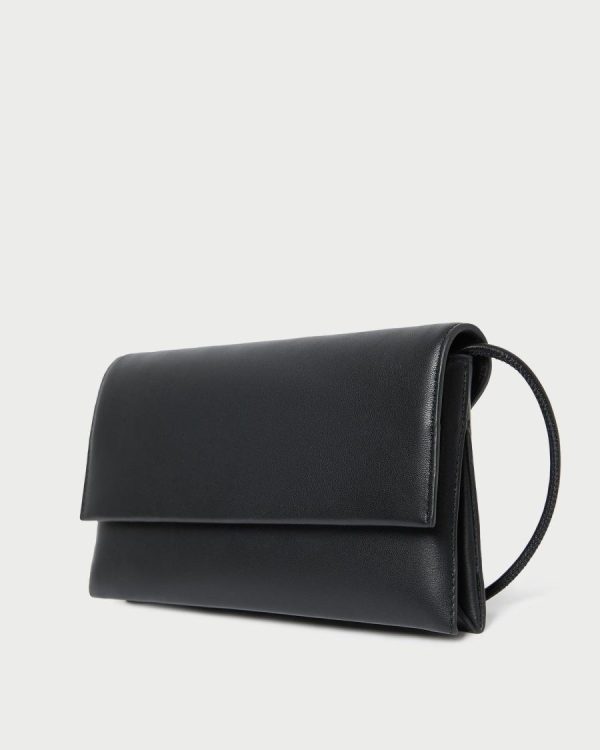 Expertly hand-sewn flap shoulder bag crafted in premium black leather. Features a versatile removable strap and distinctive exterior metal logo plaque for sophisticated everyday wear.