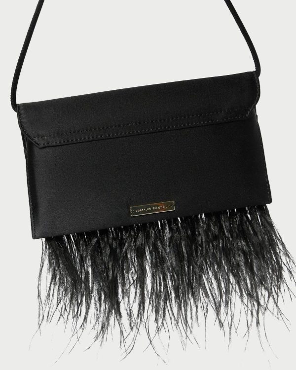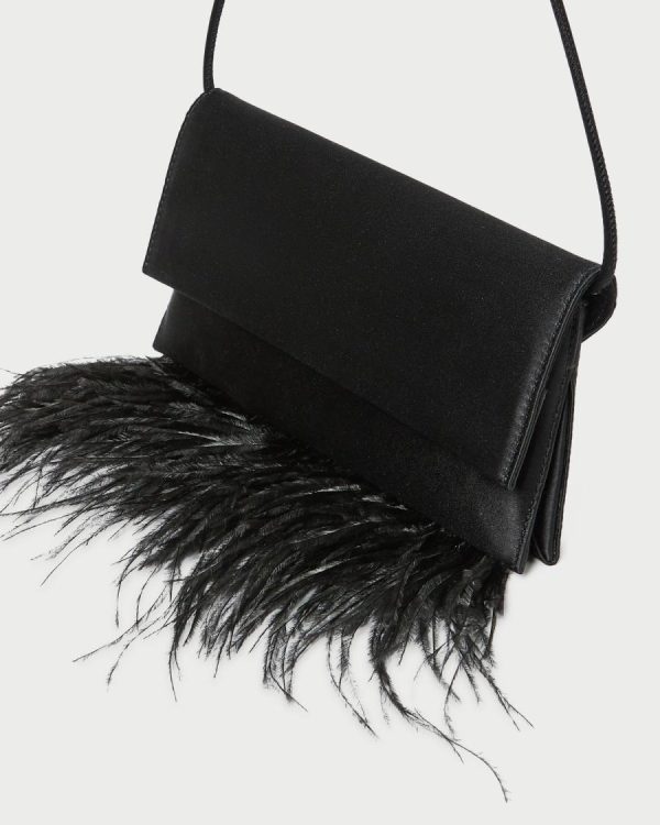 Exquisitely crafted hand-sewn flap shoulder bag in luxurious black Italian satin adorned with elegant feather detailing. Features a versatile removable strap, convenient interior zippered pocket, secure magnetic closure, and sophisticated exterior metal logo plaque.