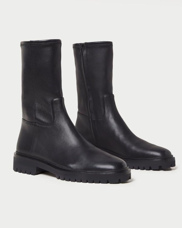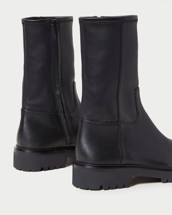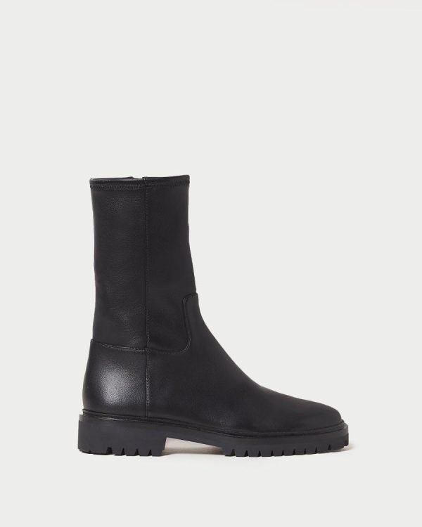 Elevate your style with these sophisticated mid shaft lug sole boots crafted in sleek black stretch leather. Designed for both comfort and durability, these boots feature a supportive padded footbed, timeless round toe design, and convenient zip closure for easy on-and-off wear. 0.5 inch heel.