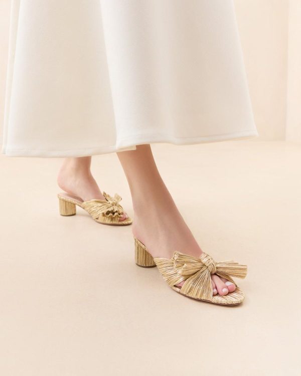 Elegant pleated mid-heel sandal crafted in luxurious gold fabric, featuring our signature statement knotted bow. Designed with a comfortable padded footbed showcasing the gold stamped logo. Open toe design with easy slip-on styling. 2 inch heel.