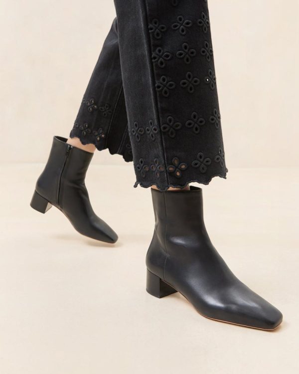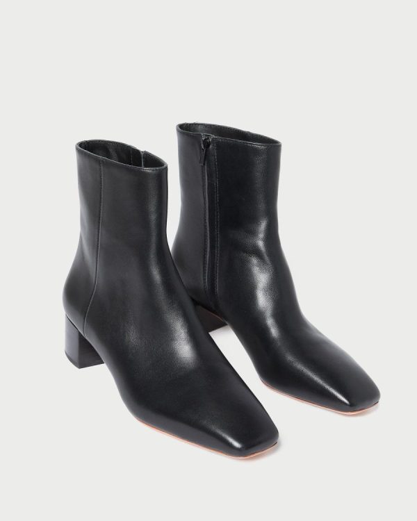 Elevate your style with these sophisticated mid-heel ankle boots crafted in luxurious black nappa leather. Designed for both comfort and elegance, these boots feature a cushioned padded footbed with the signature gold stamped logo, a contemporary square toe, and a discreet concealed side zipper for easy wear. 1.75-inch heel.