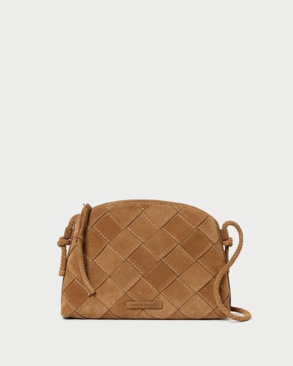 Elevate your everyday style with this beautifully crafted crossbody bag in rich toffee brown wide woven suede. Features a secure zipper closure, soft cotton lining, convenient interior pocket, and elegant gold stamped logo for sophisticated detailing.