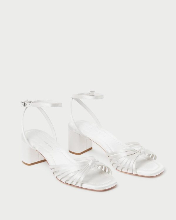 Elegant knotted mid-heel sandal crafted in luxurious cream Italian satin featuring a beautifully pieced mignon upper. Designed for exceptional comfort with a padded leather footbed, complemented by a tonal sole, sophisticated open toe design, and convenient adjustable ankle strap for the perfect fit. 2-inch heel.