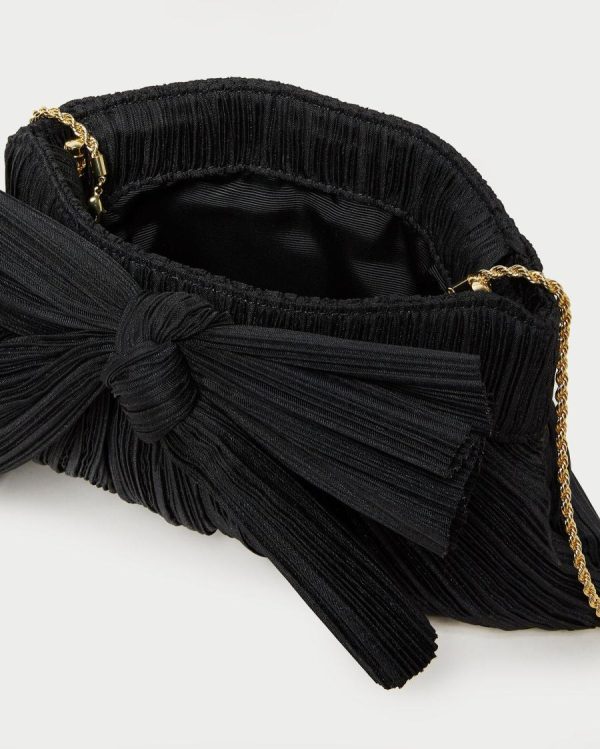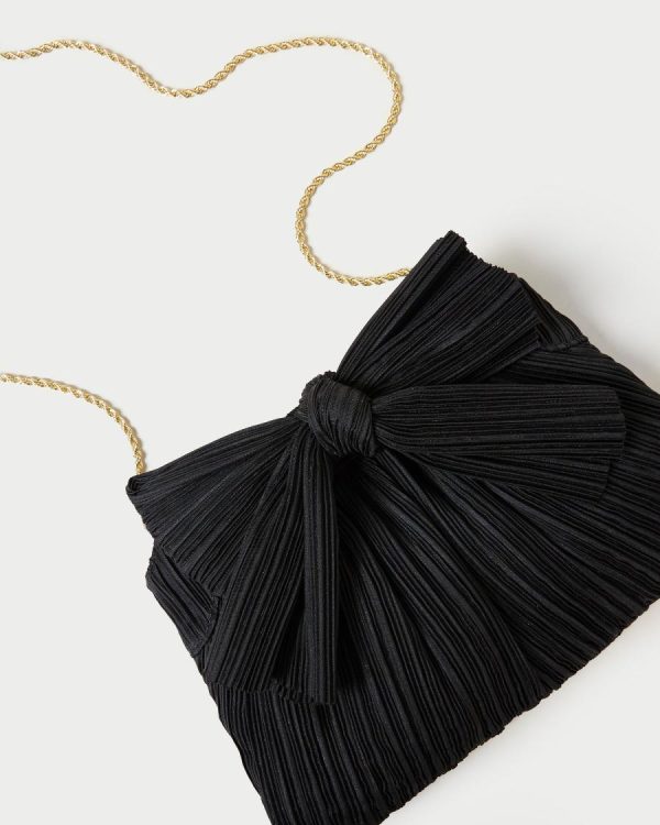 Sophisticated pleated frame clutch crafted from luxurious black organza fabric, accentuated with our signature statement knotted bow. Features a versatile removable twisted gold chain crossbody strap, secure frame closure, fully lined interior, and elegant gold stamped logo for timeless appeal.