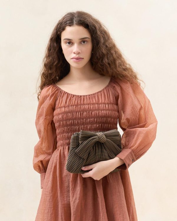 Elegant pleated frame clutch featuring sophisticated brown and black checked fabric, crowned with our signature knotted bow design. This stylish accessory includes a versatile removable twisted gold chain crossbody strap, secure frame closure, luxurious full lining, and distinctive gold stamped logo for authentic elegance.