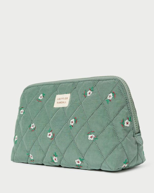 Quilted cosmetic pouch in sage green, embroidered with sweet flower details. Features an exterior cotton logo and a top-zip closure, perfect for travel.