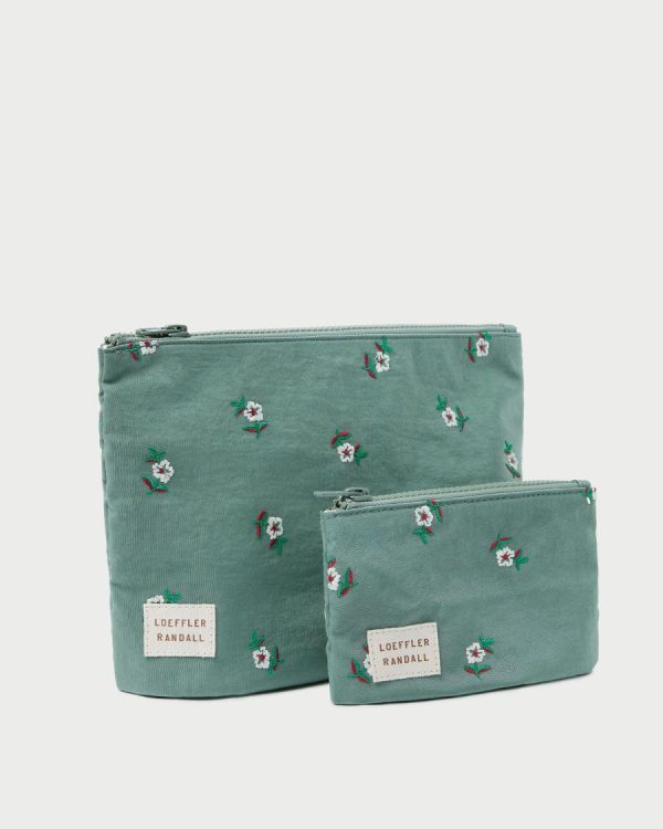 Set of two quilted pouches in sage green, embroidered with sweet flower details. Each features an exterior cotton logo and top zip closures, making them perfect for travel. Pairs perfectly with our Dina Tote.