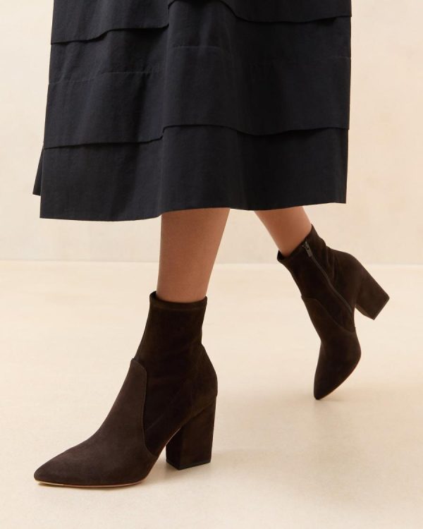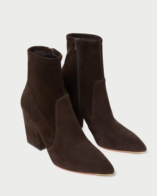 High-heeled ankle bootie with pointed toe in brown stretch suede. Features a padded footbed with gold stamped logo, a pointed toe, and a side zipper. 3.5-inch heel.