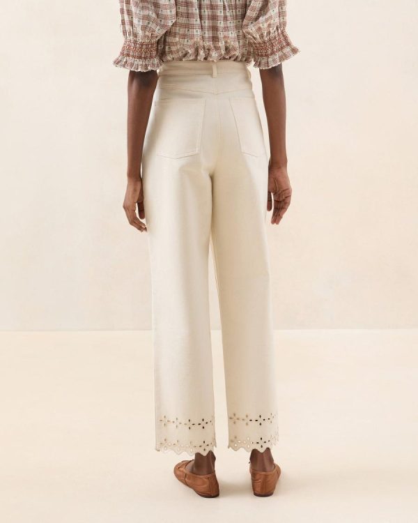 Carpenter-style pant in natural-colored denim with eyelet lace cutout detailing at the front panels. Features a fixed waist and a scalloped hem.