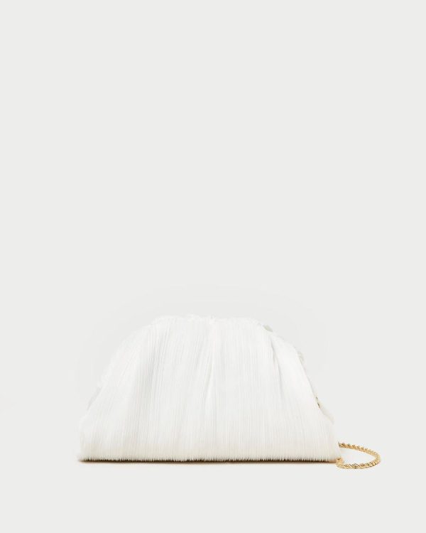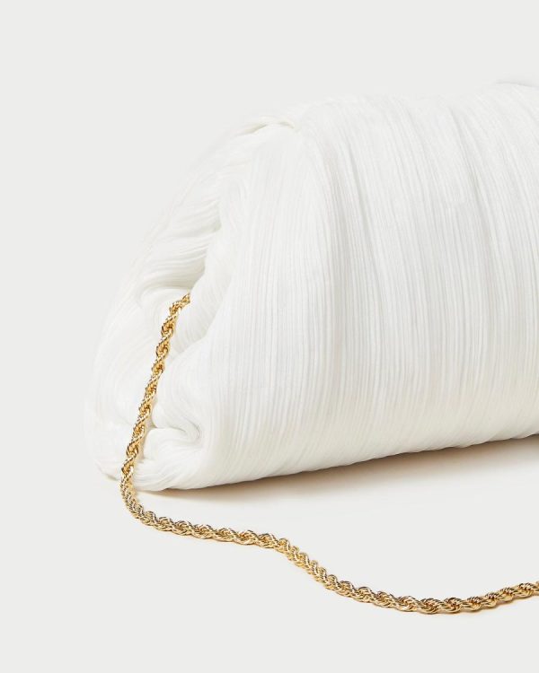 Pleated, dome-shaped frame pouch in pearl white organza. Features a removable twisted gold metal chain strap, frame closure, full lining, and interior card slot.