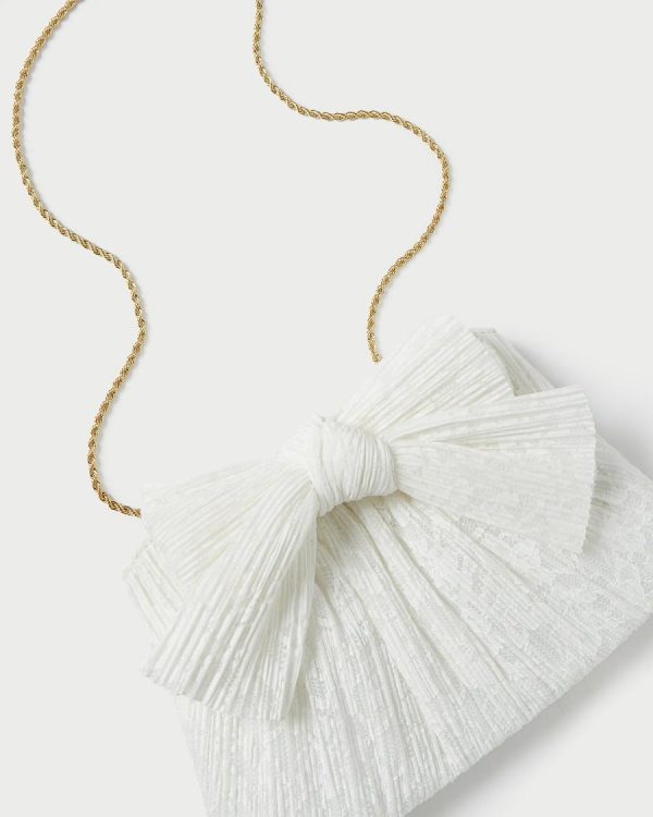 Pleated frame clutch in white fabric covered with cream lace and topped with our signature knotted bow. Features a removable twisted gold chain crossbody strap, frame closure, full lining, and gold stamped logo.