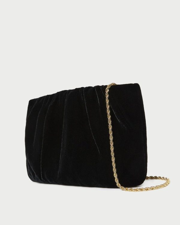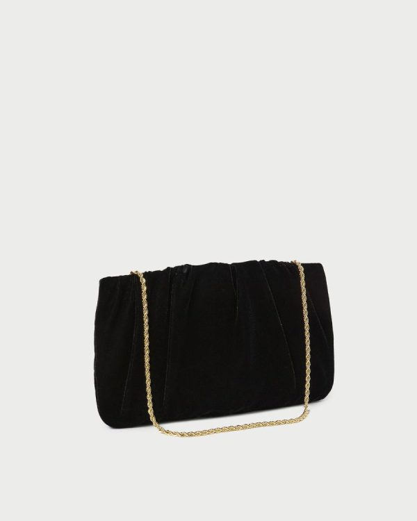 Gathered flat clutch in black velvet. Features a removable twisted gold chain strap, frame closure, full lining, and an interior metal logo plaque.