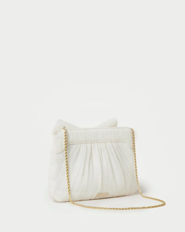 Pleated frame clutch in ivory pearl fabric topped with our signature knotted bow. Features a removable twisted gold chain crossbody strap, frame closure, full lining, and gold stamped logo.