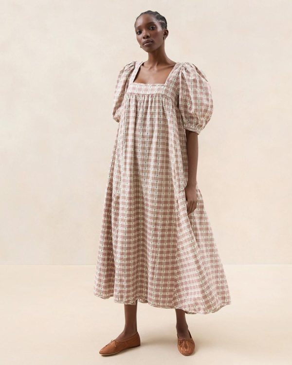 Puff-sleeve maxi dress in blue and cream floral print with a gingham trim. Features a squared neckline with an elastic panel at the back, a removable fabric belt, and flounces on the sides of the skirt for easy volume.