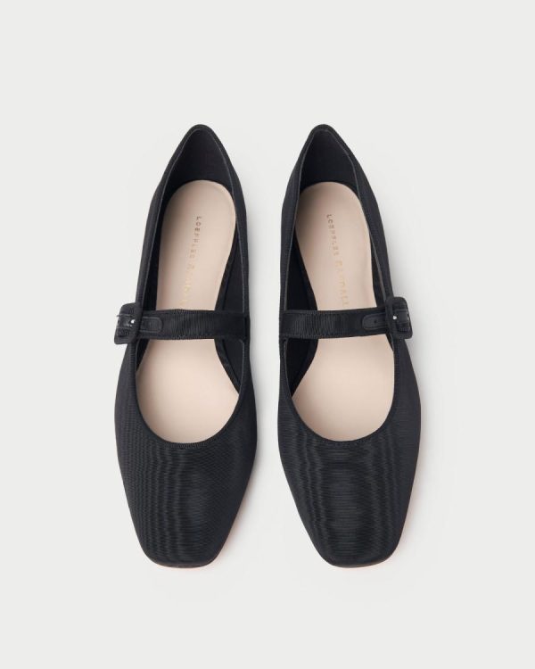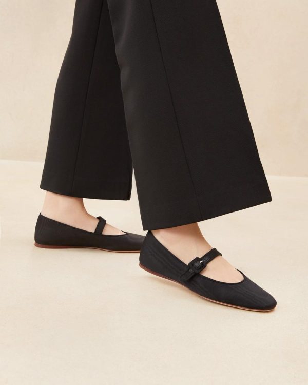 Mary Jane flat in black moiré with delicate tonal piping. Features a padded leather footbed with gold stamped logo, an almond toe, and an adjustable bridge strap with a buckle closure.