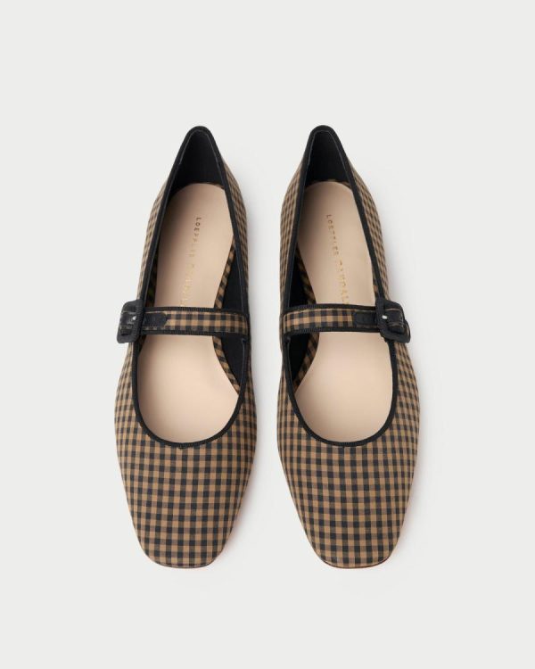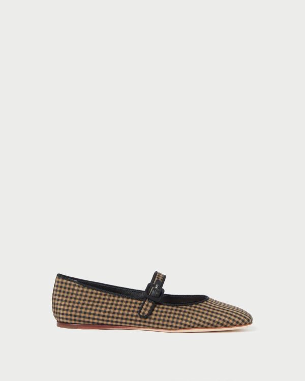 Mary Jane flat in black and brown printed cotton with delicate black piping. Features a padded leather footbed with gold stamped logo, an almond toe, and an adjustable bridge strap with a buckle closure.