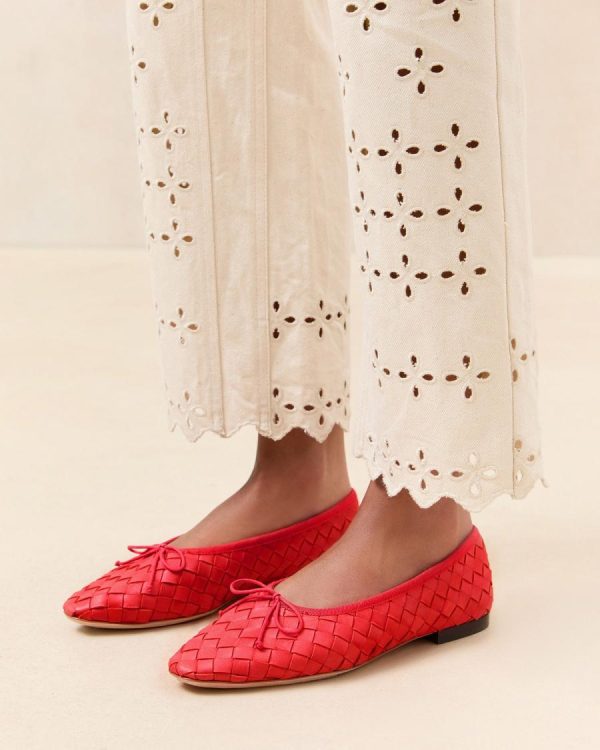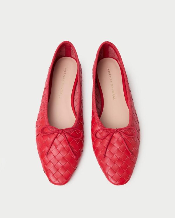 Soft ballet flat in red woven leather with bow detail. Features a padded leather footbed with gold stamped logo and an almond toe. Slips on.