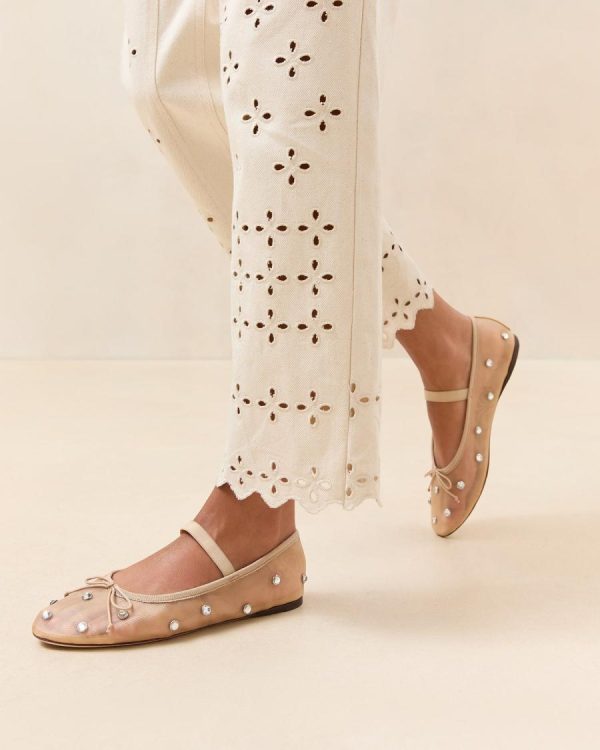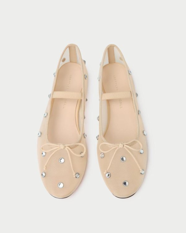 Soft ballet flat in caramel mesh with clear crystal embellishment, an elastic bridge strap, and bow detail. Features a padded footbed with gold stamped logo and an almond toe.