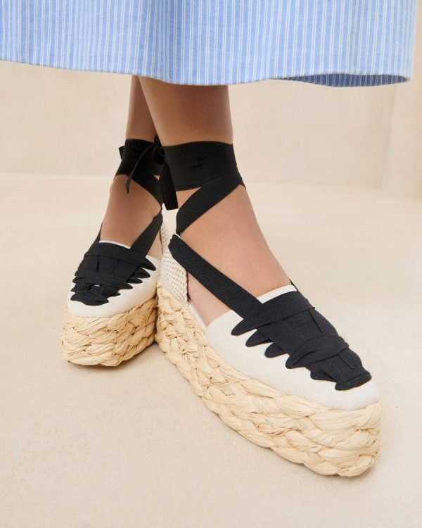 Braided flatform espadrille sandal with natural raffia sole and a natural canvas upper. Features a padded leather footbed, a black ribbon detail, a closed toe, and an adjustable ankle tie. 2.75-inch platform.