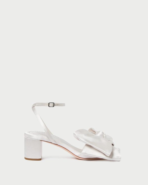 Mid-heeled sandal in cream Italian satin. Features an statement bow, a padded leather footbed with gold stamped logo, and an adjustable ankle strap. 2-inch heel.