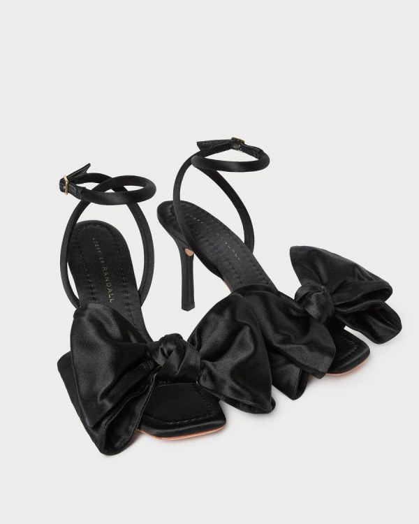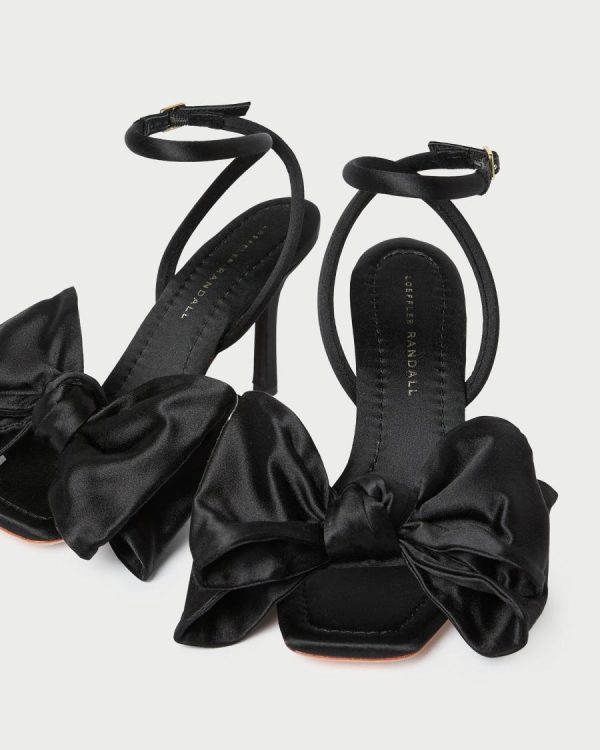 High-heeled sandal in black satin. Features a statement bow, a padded leather footbed with gold stamped logo, and an adjustable ankle strap. 3.5-inch heel.