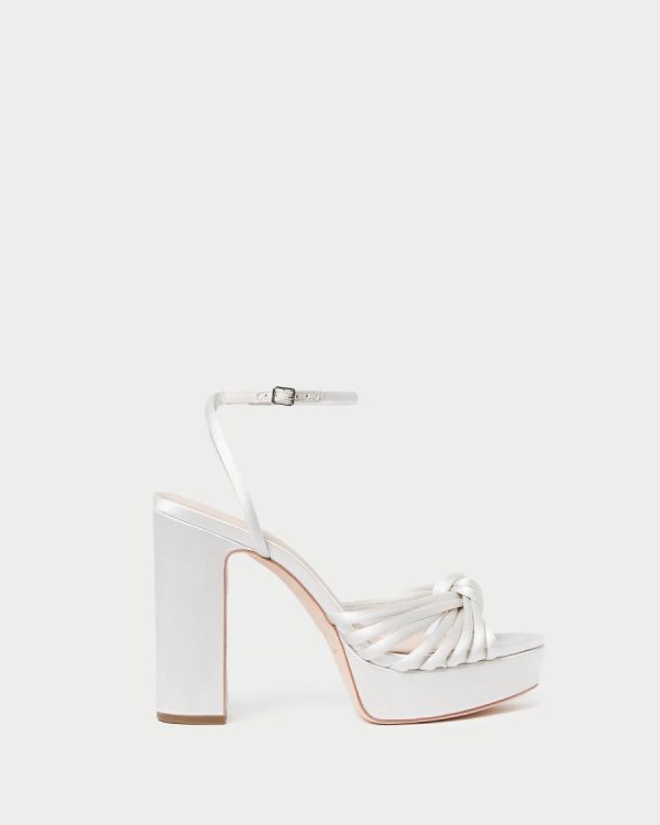 Knotted, heeled platform sandal in cream satin with a pieced mignon strap. Features a padded leather footbed with gold stamped logo, an open toe, and an adjustable buckle ankle strap. 5-inch heel, 1.5-inch platform.