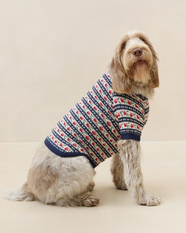 Dog sweater in navy wool with a cream and pink floral intarsia pattern. Pair it with our Idris Intarsia Cardigan, so you can match your puppy perfectly.