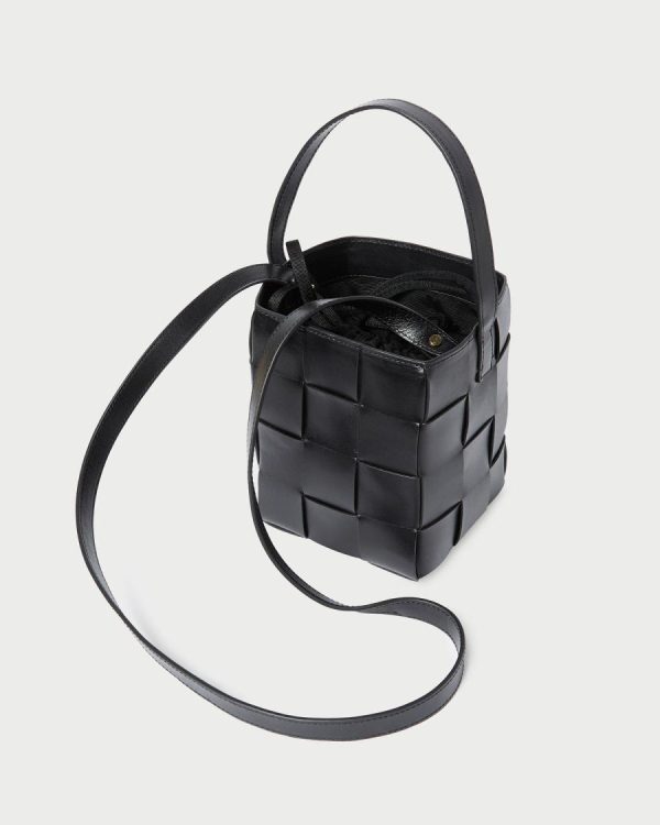 Small bucket bag in black wide woven vachetta leather. Features a vachetta leather strap, drawstring closure, and full lining.
