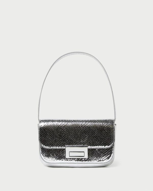 Shoulder baguette bag in silver embossed snake leather. Features slim tonal handles, a push lock closure, full lining, interior zippered pocket, and exterior slip pocket.