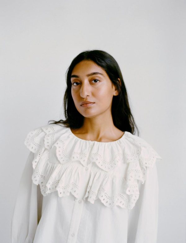 Button-down shirt in milk-hued cotton poplin. Features custom-embroidered ruffle on neckline and sleeves, flower-shaped buttons, bracelet-length sleeves, elastic at sleeve openings, and a boxy fit.