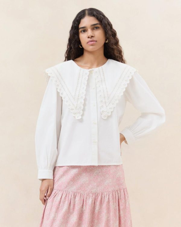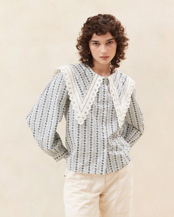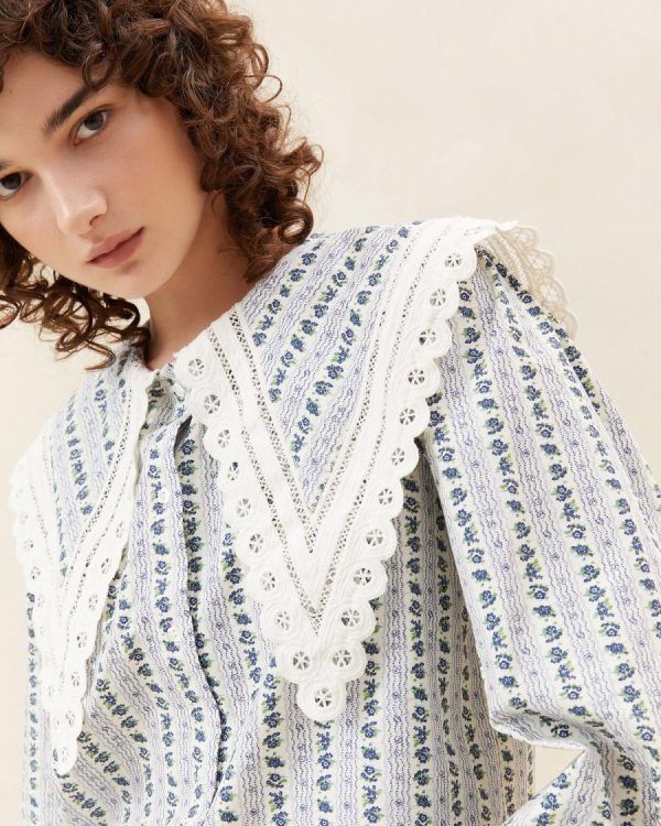 Long-sleeve top in cream and blue wavy floral print cotton. Features a rounded neckline, pointed collar with delicate lace trim, balloon sleeves, buttons at front, and a generous fit.
