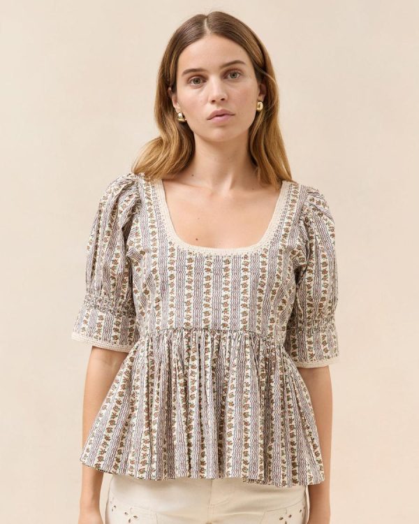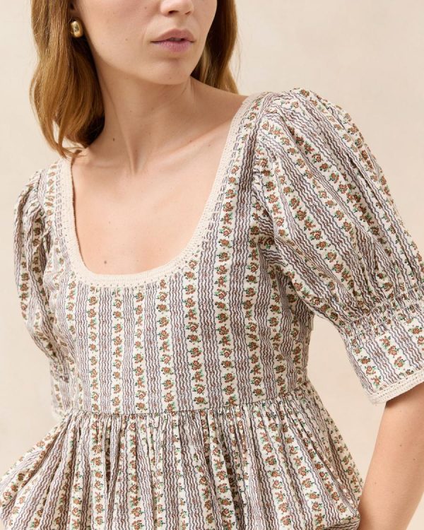 Short-sleeve top in brown and cream wavy floral cotton. Features puff sleeves, a round neckline, a flowy ruffle at the hem, and a side zipper.