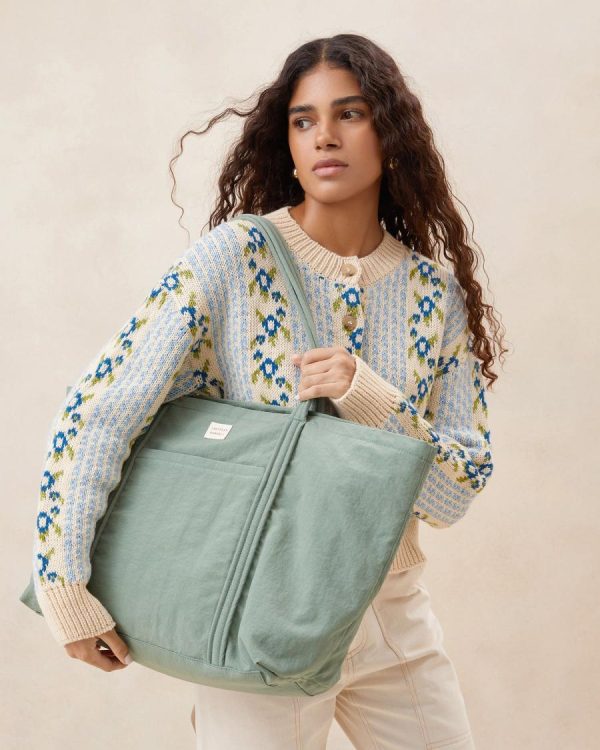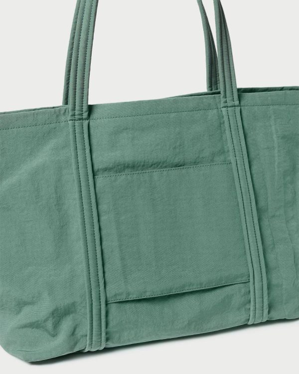 Tote bag in sage green washed nylon. Features a tonal strap, zipper closure, and exterior cotton logo. Also includes exterior pockets with zipper closure, interior pockets for easy organization, and an exterior back panel for stacking on luggage.