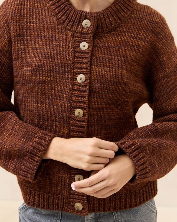 Elevate your wardrobe with this sophisticated mock-neck cardigan crafted from premium brown wool. Features elegant tortoiseshell buttons and refined ribbing along the neckline, wrists, and hem for a polished finish.